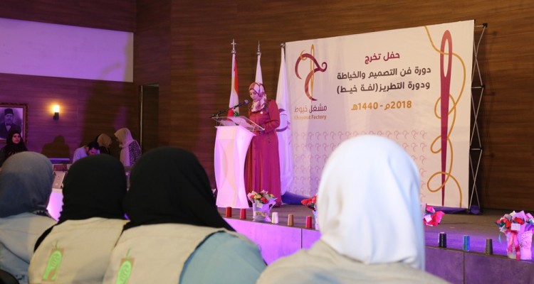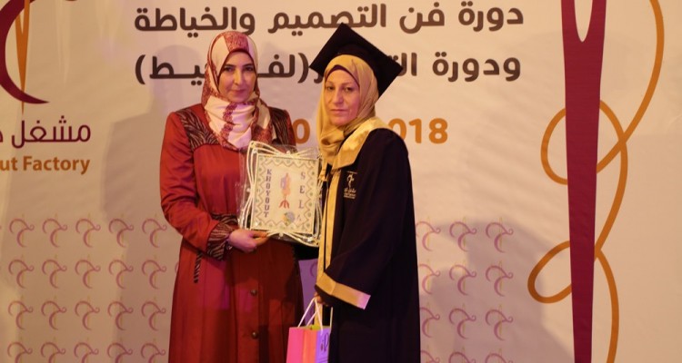 كما وأعلنت السيدة أمل عن تبني لجنة فلسطين الخيرية لدورة الخياطة للعام 2019 وشكرتهن على دعمهن وتمويلها. مقدمةً الشكر لجمعية غراس على إشرافها على مشغل خيوط، وبيت الزكاة الكويتي على تمويله دورة الخياطة، والانتربال على دعمها دورة لفة خيط.