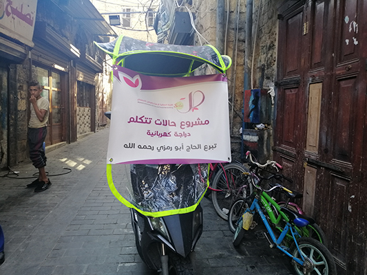 ضمن مشروع حالات تتكلم كانت حالة السيدة ف.ع أرملة مع خمسة أيتام وضعهم الاقتصادي معسور جداً، أصبح ابنها الأكبر ذو الـ 19 ربيعاً المعيل الوحيد للعائلة وحصل على فرصة عمل في توصيل الطلبات للشركات، لكن شرط العمل كان تأمين دراجة كهربائية وهو ليس بمقدوره شراؤها، وبتبرع كريم من الحاج أبو رمزي رحمه الله من الكويت، استطاعت جمعية صلة تقديم الدراجة الكهربائية المطلوبة وتم تركيب مظلة لتقيه من الأمطار أثناء التوصيل، وقد بدأ عمله فور استلامه الدراجة.
